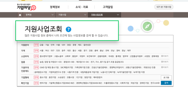 – 지원사업 검색 시 다양한 필터 제공 (지원분야, 업종, 지역 등)