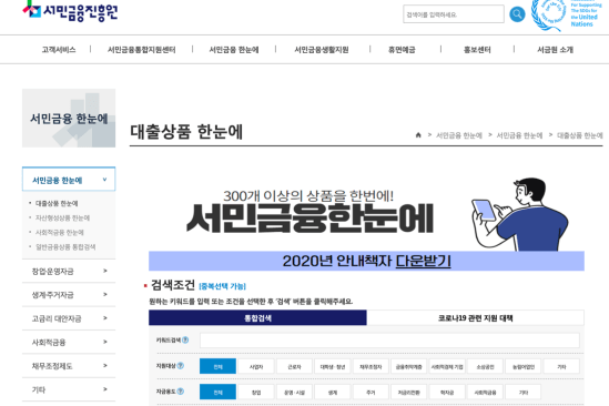 서민금융진흥원에는 서민금융 한눈에 하위에 ‘대출상품 한눈에’라는 대출검색 서비스가 있습니다. 연령별, 소득별, 지역별 300여개 서민 대출상품을 필터링해서 찾아볼 수 있다는 점이 특징입니다.